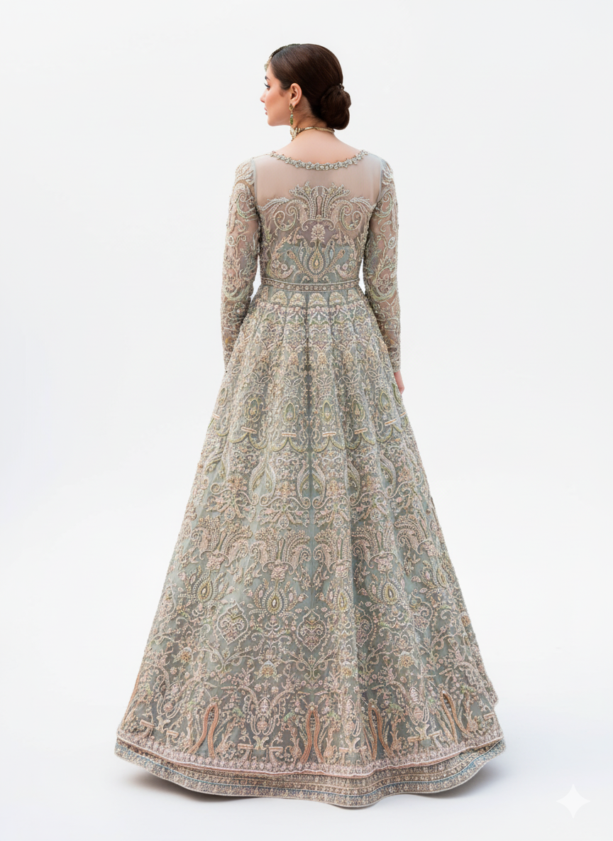 Exuding elegance and modern femininity, Saleha is an unstitched couture ensemble featuring a delicate ice blue organza gown intricately adorned with naqshi, dabka, crystals, pearls, and sequins. It is paired with a self-jamavar lehenga, detailed with an embellished border for a regal touch.
