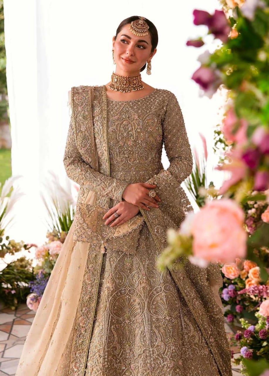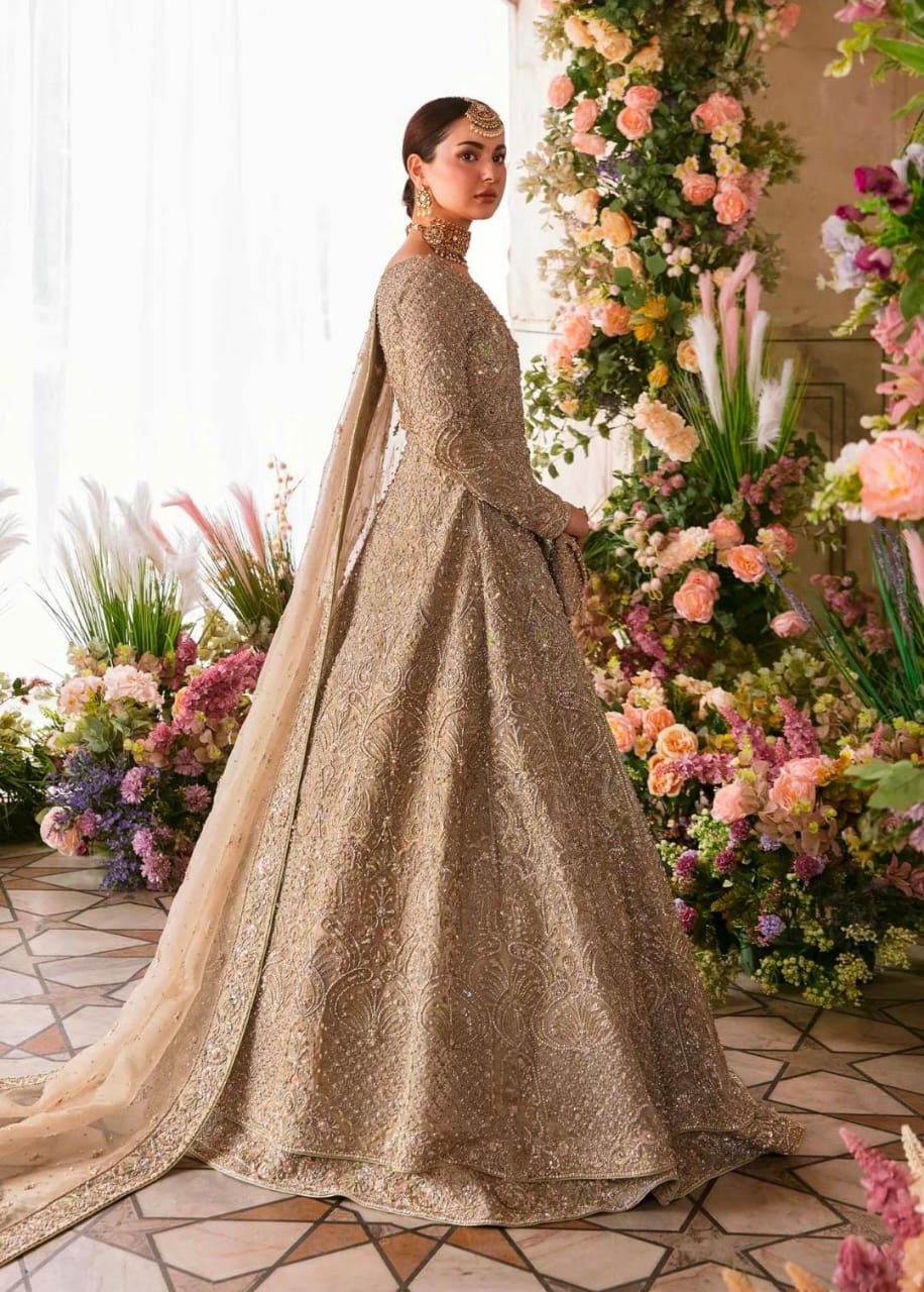 Minha” is all about delicacy personified on a nude colored organza pishwas, which exhibits heavenly embellished geometric and floral patterns, adorned with rich, magnificent details. Paired with a self jamavar lehanga, with fully embellished exquisite border along with delicately paired with organza dupatta with four sided embellished border and extended pallu and booti spray. Moreover, a beautiful light champagne luxe net veil with pearls spray and four-sided intricate border has been added to give a goddess look to the outfit..